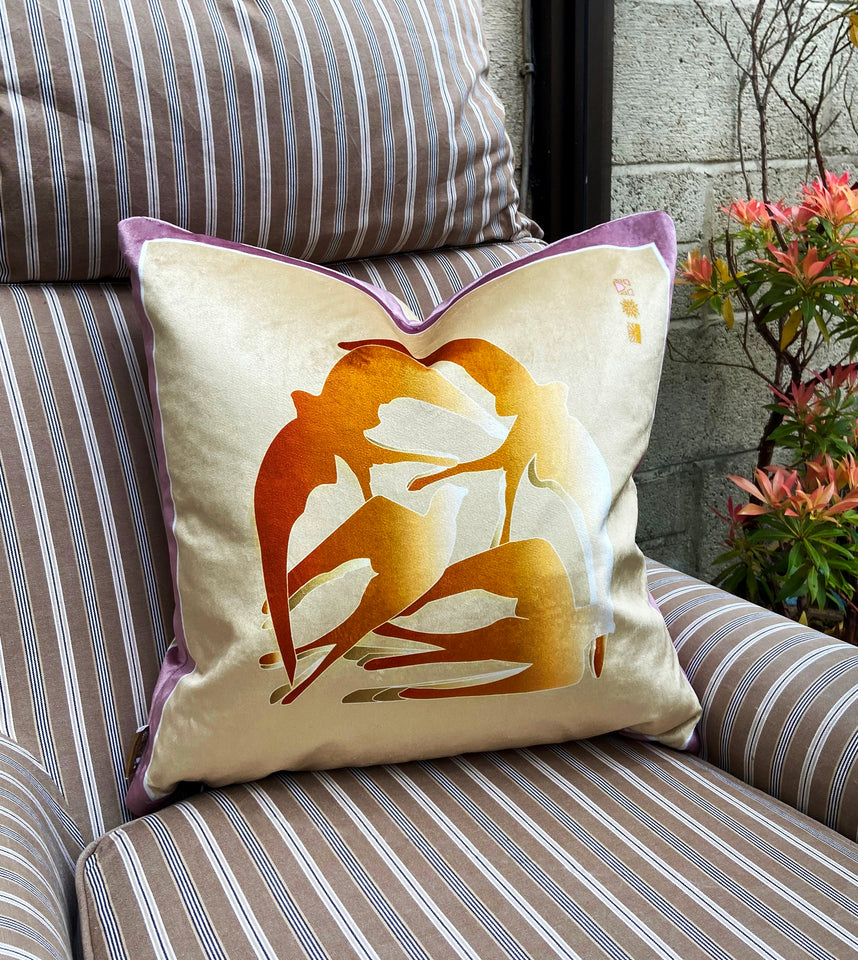 This Art Deco motif is inspired by the wonderful aerial acrobats we call swallows on Howth Head ducking and diving in the summer air. These impossibly elegant summer visitors provide a warm and colourful counterpoint to our interiors whatever season you're in. Statement accent pieces, they are available in either shimmer velvet (a sumptuous tactile fabric that is soft to the touch), or on a subtle linen/cotton mix.